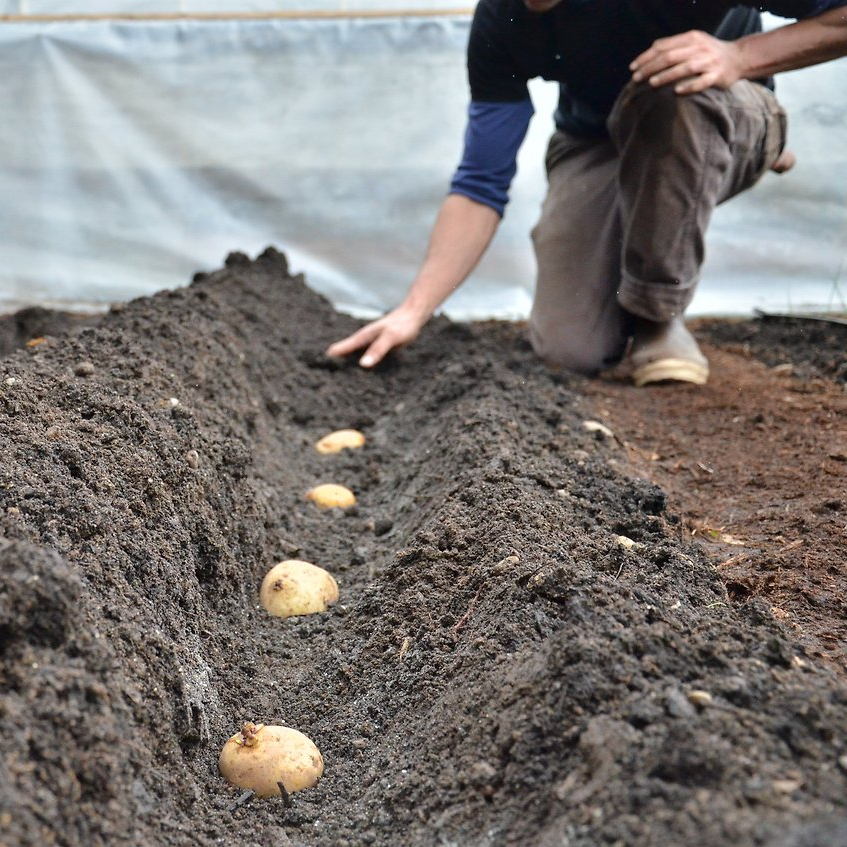 - 복합비료를 넣은 뒤 흙을 약 5cm 덮어 비료가 씨감자에 직접 닿지 않게 합니다.