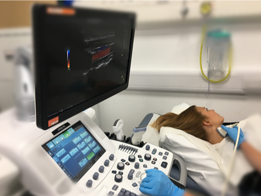 2. 누운 자세 유지 – 목을 15° 가량 뒤로 젖혀 검사사가 좌·우 경동맥, 추골동맥까지 스캔합니다.
