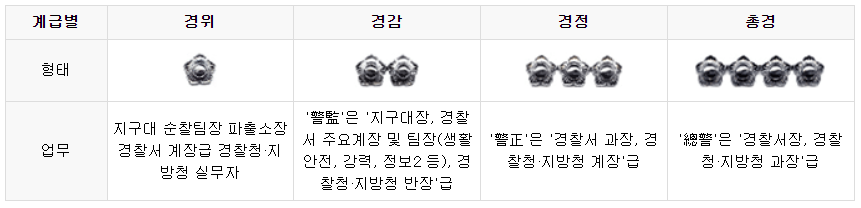 2. 경위, 경감, 경정, 총경: 이 계급들은 계급장의 중앙에 태극장을 배치하고 무궁화의 수로 직급을 구분합니다. 이들의 역할은 경찰 체계에서 보다 전략적인 위치에 있으며, 전반적인 치안 관리 및 운영에 관련된 역할을 수행합니다.