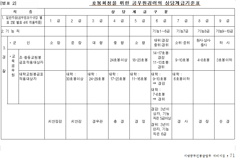 지방 공무원 봉급업무 처리지침의 별표 규정으로 제공되는 기준표로 원래 용도는 타 직렬 공무원 경력자의 공무원 임용 시 호봉을 얼마나 책정할지 정할 때 사용하는 기준표입니다.