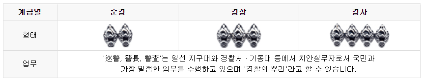 1. 순경, 경장, 경사: 이 계급들은 계급장의 하단부 태극장 위에 무궁화 잎이 2개로 쌓아 봉오리의 수로 계급을 결별합니다. 이들은 경찰의 뿌리라고 할 수 있는 직급이며, 이들이 국민과 가장 밀접하게 대화하며 치안을 유지하는 역할을 합니다.