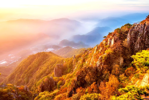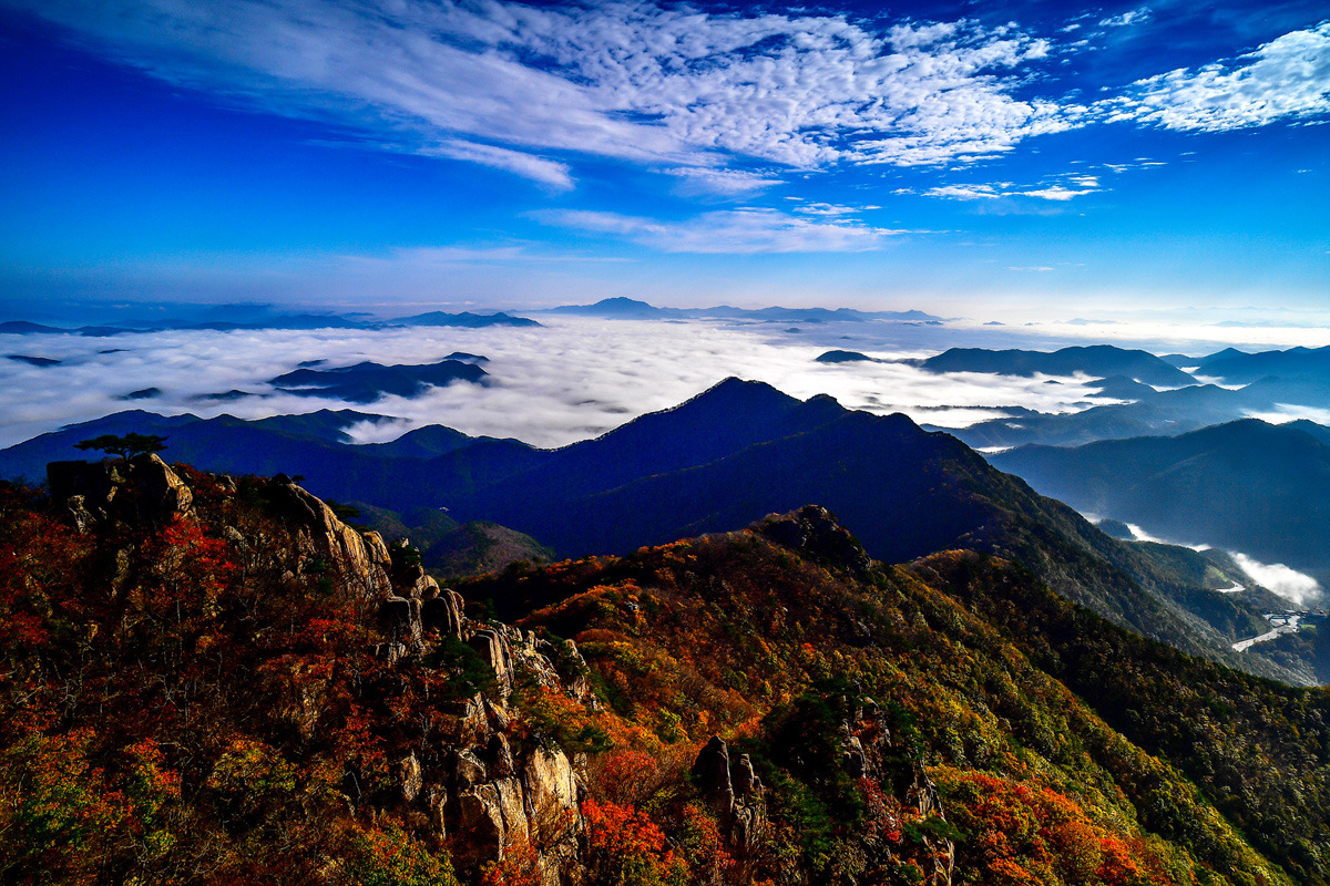 금강구름다리에서는 붉은 단풍 사이로 내려다보는 절벽 풍경이 압도적이며, 마천대 정상에서는 논산평야와 금산방향으로 펼쳐지는 단풍 군락이 장관을 이룹니다. 대둔산의 단풍은 나무의 종류가 다양해 색감의 층차가 풍부한 것이 특징인데, 단풍나무, 신갈나무, 층층나무, 서어나무, 굴참나무 등이 고루 섞여 붉은색, 주황색, 노란색이 겹겹이 물드는 ‘색의 파도’ 같은 느낌을 줍니다.