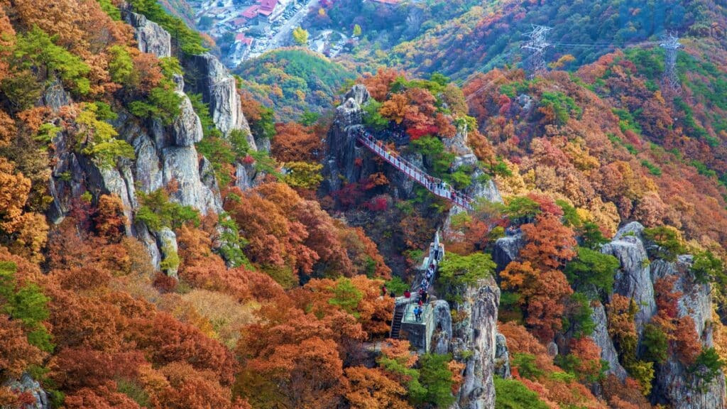 대둔산(大芚山, 해발 878m)은 중부권 단풍 명소 중에서도 가장 드라마틱한 풍경을 보여주는 산입니다. 산세가 험준하면서도 기암괴석이 많아 단풍이 바위 틈새로 물드는 모양이 독특하며, 가을철 짙은 붉은빛과 황금빛이 조화를 이룹니다. 특히 ‘삼선계단’, ‘금강구름다리’, ‘마천대 전망대’는 단풍철 포토존으로 유명합니다.