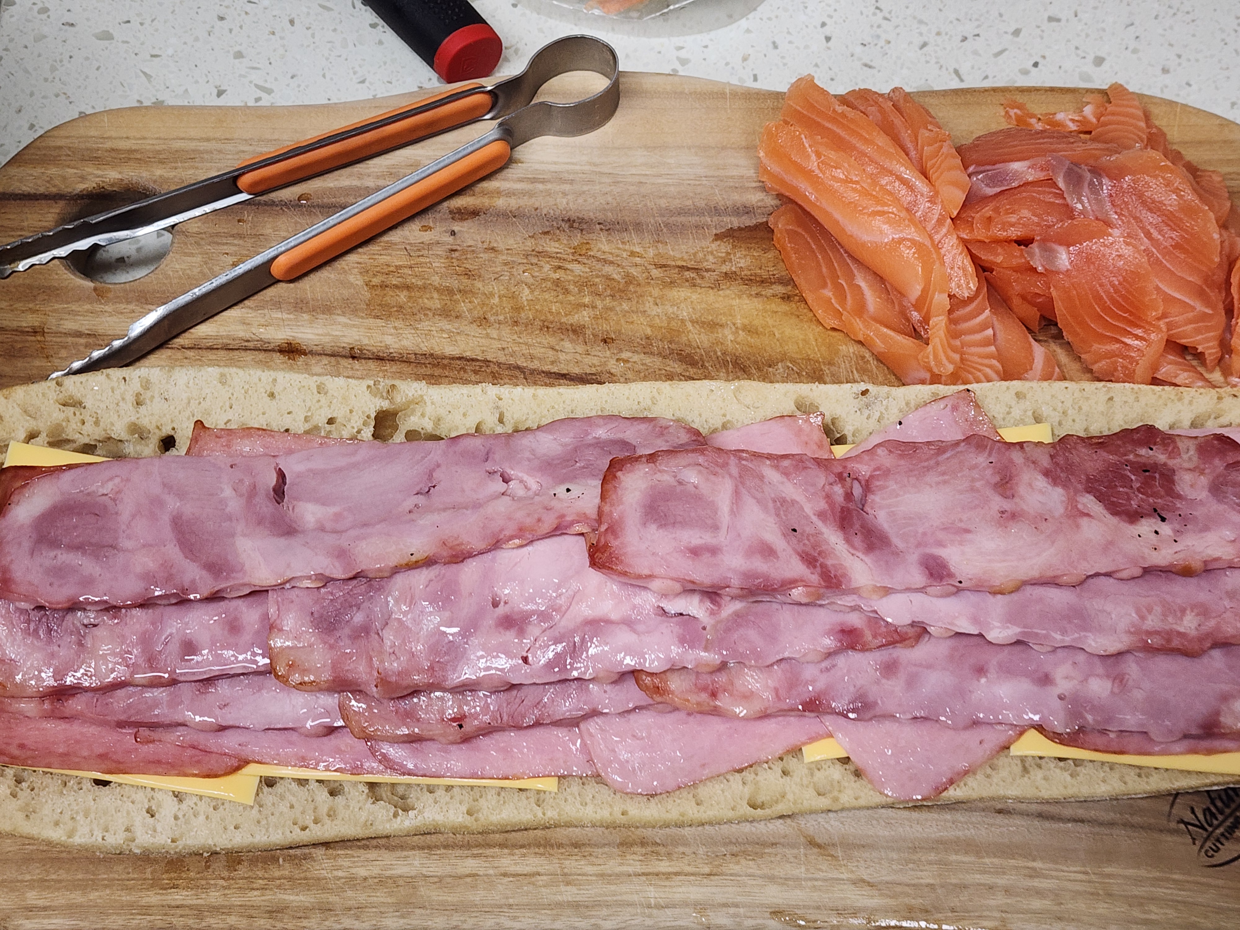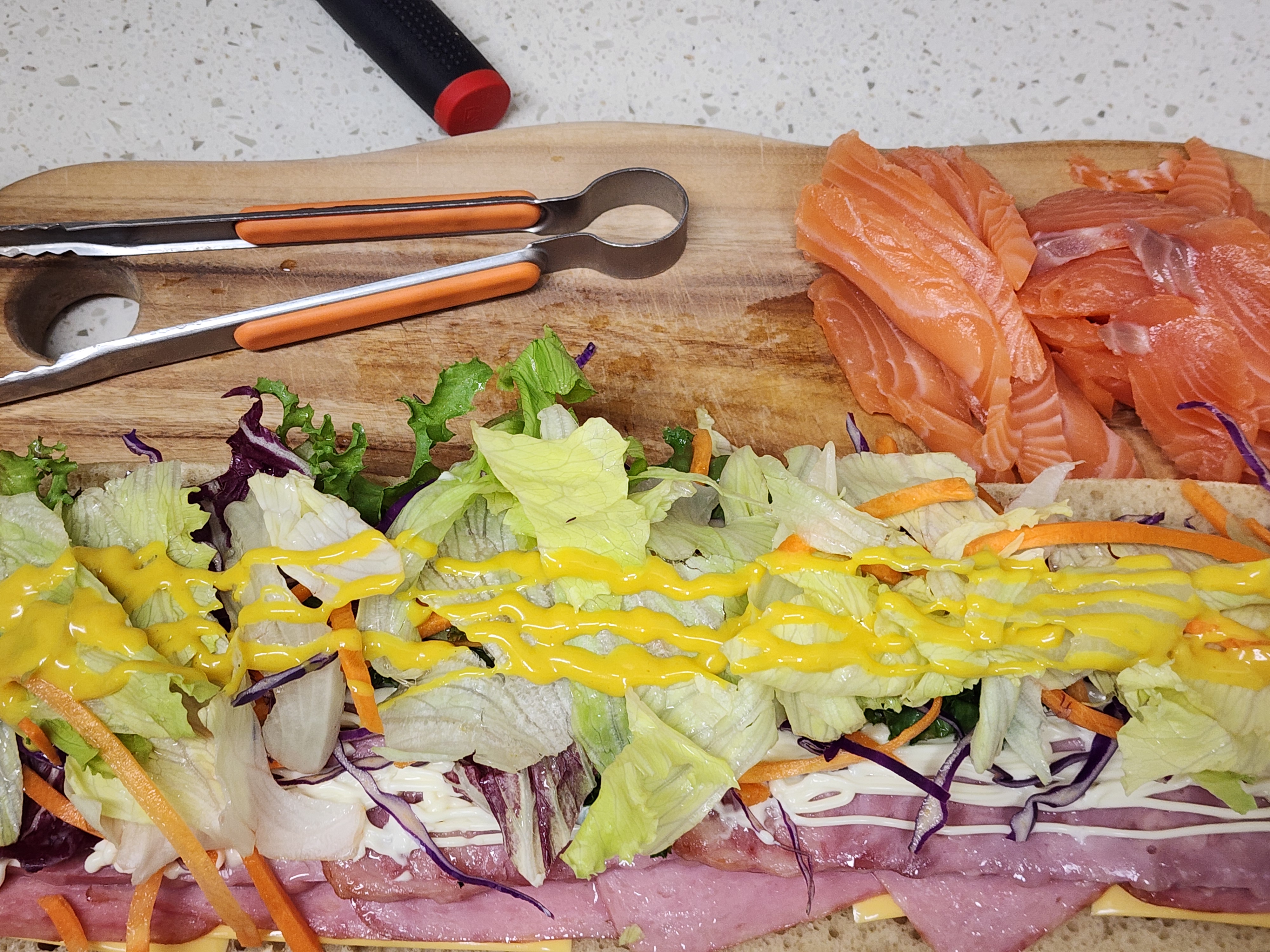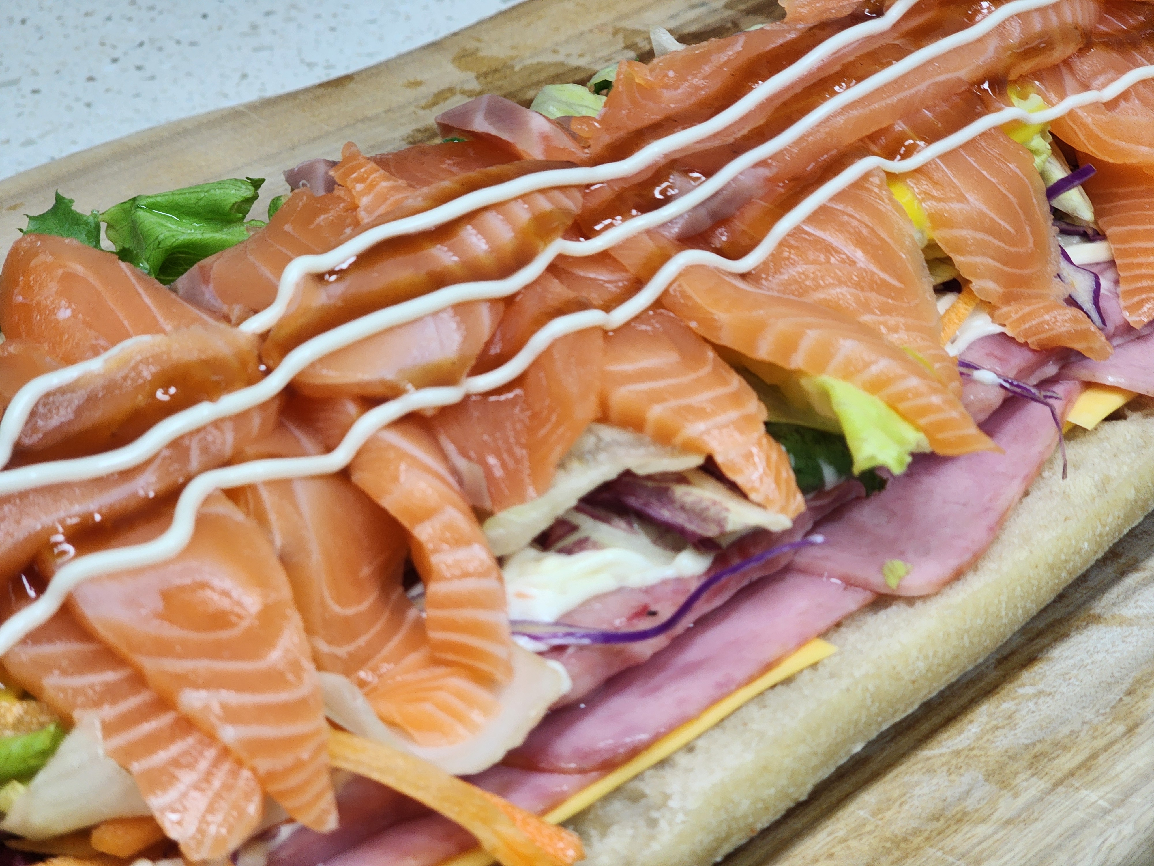 완성된 모습은 사진으로도 확인할 수 있듯이 압도적인 퀄리티입니다. 얇게 슬라이스한 연어가 겹겹이 쌓여 있으며, 채소와 햄, 치즈의 조화가 보기만 해도 군침을 돌게 합니다.