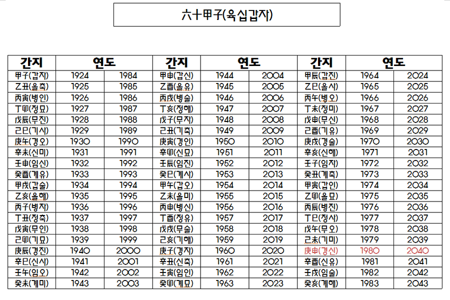 아래는 60갑자의 조합을 나열한 표입니다. 이 육십갑자표를 통해 연도별 또는 일별로 어떤 천간과 지지가 결합되어 있는지 확인할 수 있습니다.