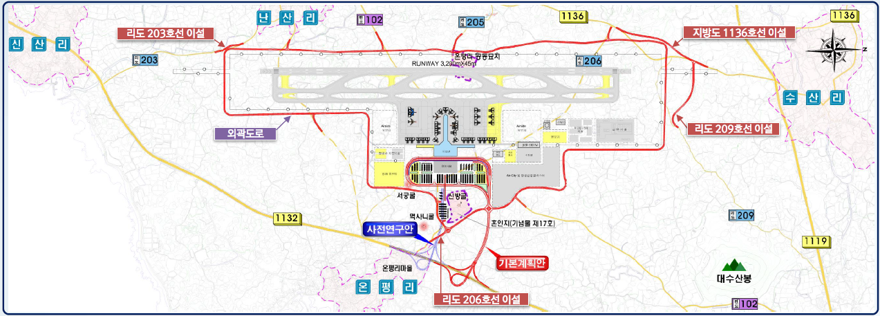 성산읍 전체를 기준으로 보면 공항 개발은 기존 생활권 구조를 완전히 대체하지 않으면서도 지역 전반의 교통 축선을 재편할 수 있는 규모로 반영되어 있습니다. 기존 도로망이 단절되지 않도록 외곽으로 순환도로를 계획한 점도 이러한 지역 균형 접근을 보여줍니다. 계획된 외곽도로는 공항을 완전히 둘러싸는 형태로 개설될 예정이며, 이 순환도로는 공항 접근성을 360도로 확보하는 기능을 합니다. 기존 마을 진입로가 공항 건설로 단절되지 않도록 외곽도로와 기존 도로가 자연스럽게 연결되도록 설계된 것이 특징입니다.