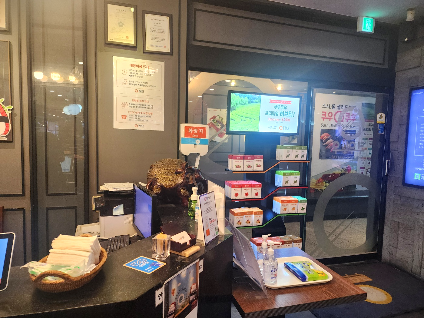 - 스시류: 광어, 광어묵은지, 연어, 육회, 새우, 장어, 한치, 계란, 게살, 유부, 가리비, 그릴, 훈제오리, 오징어 등