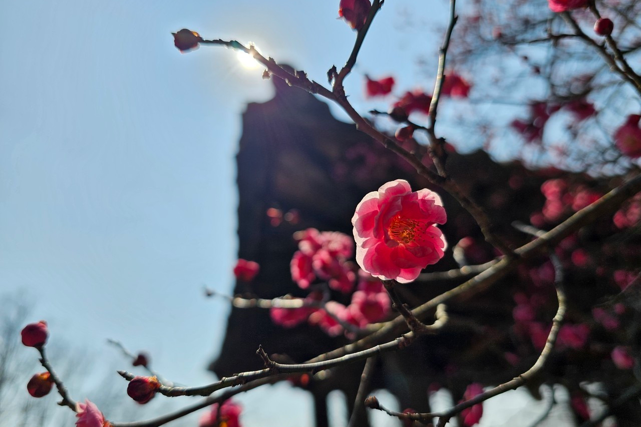 - 포인트: 기와-담장-전각을 배경으로 홍매화 색이 살아남, 인물-풍경 모두 유리